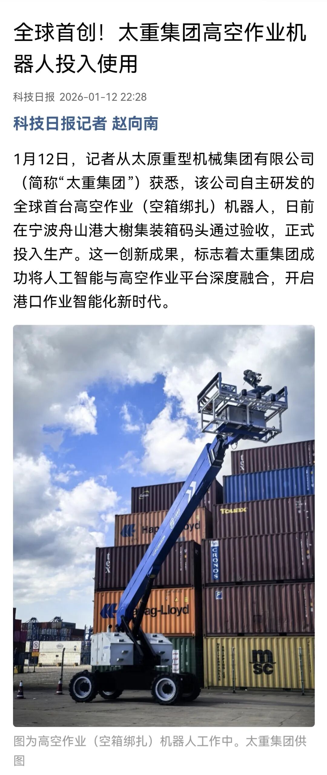 全球首创!太重集团高空作业机器人投入使用