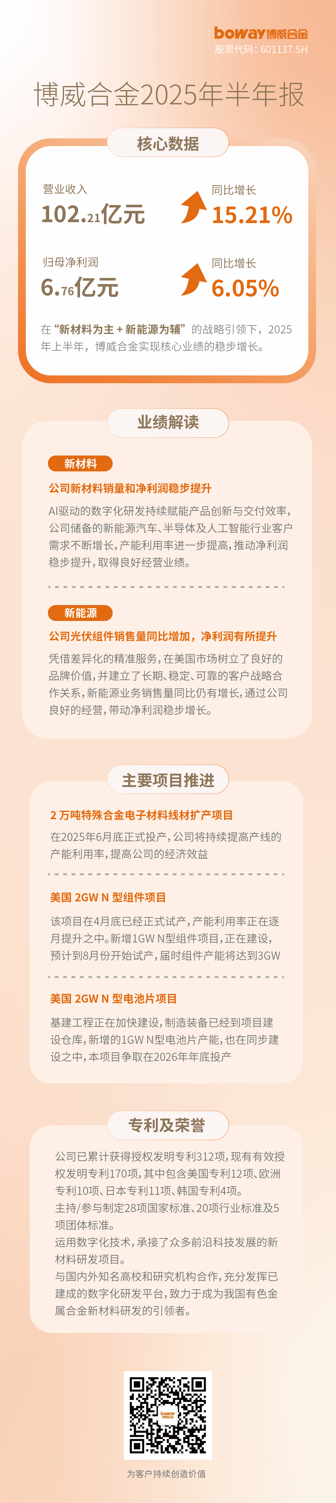 博威合金(601137.SH)发布2025年半年报。报告期内,公司实现营业收入102.21亿元,同比增长15.21%,归母净利润达6.76亿元,同比增长6.05%。在“新材料为主,新能源为辅”的战略引领下,2025年上半年,博威合金实现核心业绩的稳步增长。
