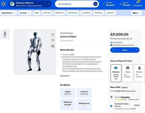 据悉,中国宇树科技的G1人形机器人目前已上架美国沃尔玛官网。