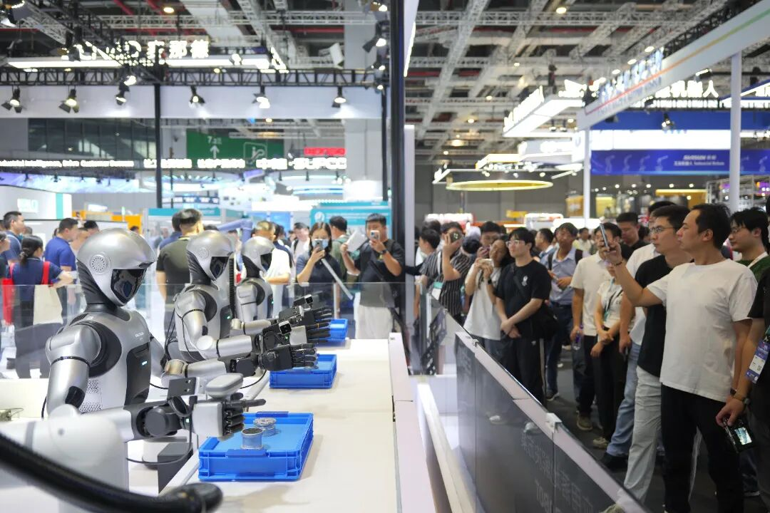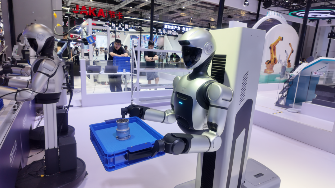 在2025年上海工博会上,埃斯顿酷卓以“具身智能·智领未来”为主题,展示了以“快慢系统”协同架构为核心的具身智能机器人工业应用落地解决方案。该方案集成了双臂人形机器人、轮式人形机器人、协作机器人、PLC 控制以及智能化算法,完整演示了从工件上料、扫码、装配到智能搬运的具身智能多形态、复杂任务应用落地全流程。