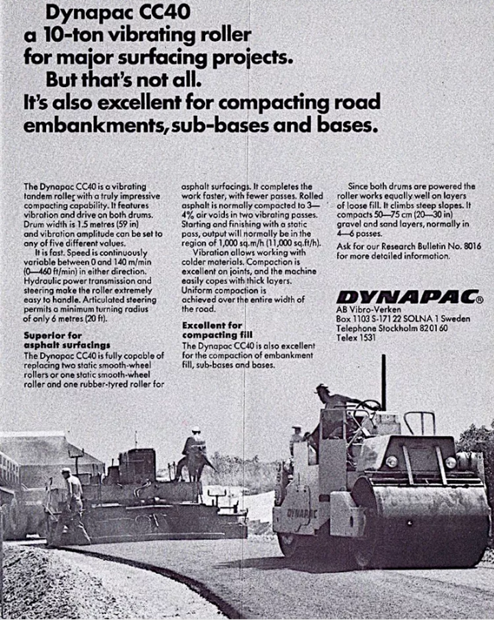 戴纳派克压实技术的发展历程,几乎涵盖了现代压实技术创新与研发积累的完整历程。从早期的混凝土振捣器专利,到振动式土壤压路机的问世,再到“Ball-and-race 原理”的专利发明,至1958年的世界首台振动式土壤压路机和1970年问世的世界上第一台单钢轮压路机CA25,而在路面技术领域,随着沥青的广泛应用,戴纳派克具有划时代意义的CC型号沥青压路机CC40也开始在60年代正式登场。而这诸多的“第一”绝非空中楼阁,每一项“首创”都凝聚着戴纳派克的大量实践验证积累和对技术极致追求的智慧结晶。