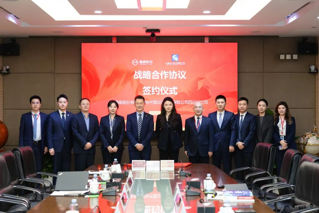 11月3日,通威股份与中国出口信用保险公司(以下简称“中国信保”)四川分公司在通威股份总部举行战略合作会议暨签约仪式。中国信保四川分公司党委书记、总经理张秦,党委委员、副总经理吴俊丽到访座谈交流并签约。通威股份董事长、CEO刘舒琪,财务总监周斌,营销副总裁薛青松,财务部部长甘露等热情接待并出席会议。双方围绕深化战略合作、共谋全球化发展进行了深入交流。