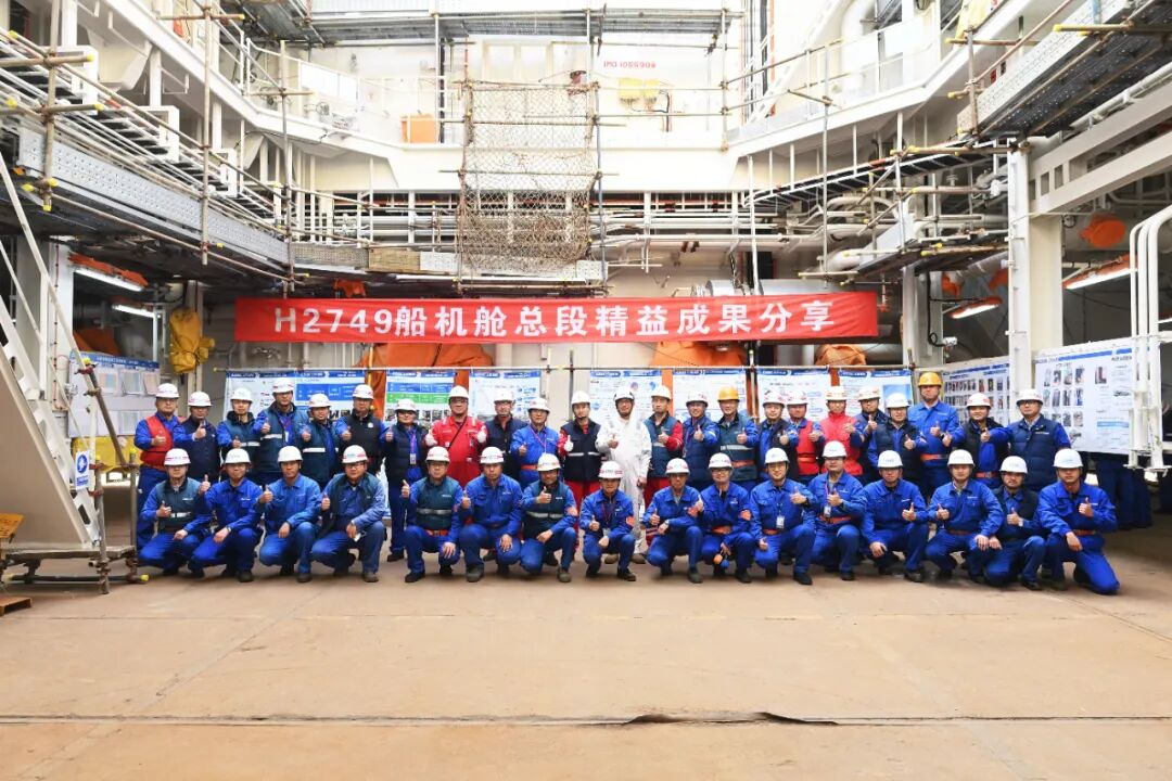 12月5日下午, AW驻厂监造代表,LR船级社驻厂代表,公司党委副书记、总经理肖文林,公司总经理助理梁小军,天津大学精益团队及公司各相关部门负责人汇集于7号平台22Z总段下,共同见证H2749船精益硕果及机舱功能总段入坞。
