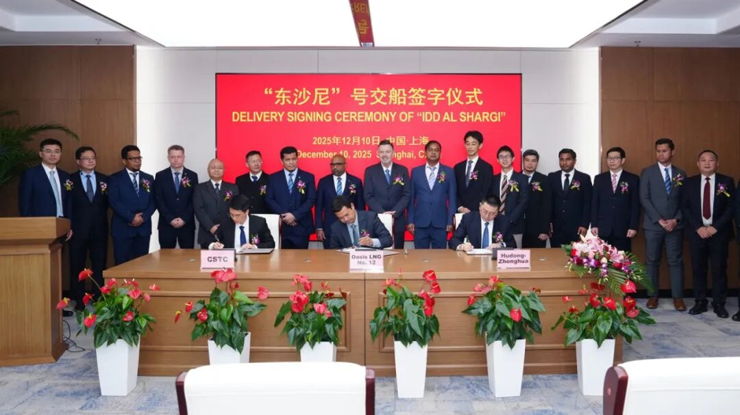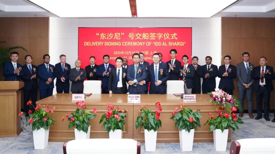 12月10日,公司为卡塔尔能源二期项目建造的第五艘船 “东沙尼”号顺利交付,这是公司今年交付的第10艘LNG船,再创中国纪录。 马来西亚国际航运公司改装及新造船部部门长Yusmi Ismail代表船东方,中国船舶工业贸易有限公司船海业务三部业务经理曹明生代表贸易方,公司总经理助理、营销部部长王佳颖代表建造方,共同签署交船文本。卡塔尔能源液化天然气公司驻沪东中华现场经理Geir Bratland代表租船方,对船东代表进行租赁授权。公司LNG副总建造师黄华兵,MISC、CLNG、日本邮船、美国船级社、中国船级社、中船贸易和公司相关部门代表一同参加交船仪式。