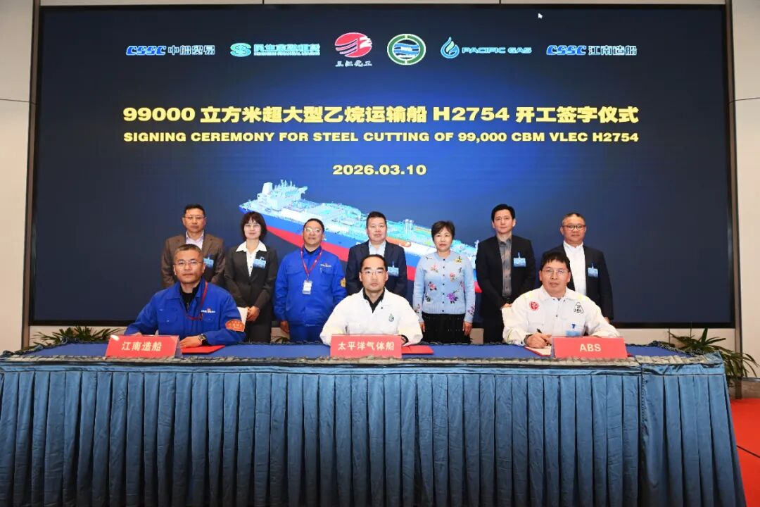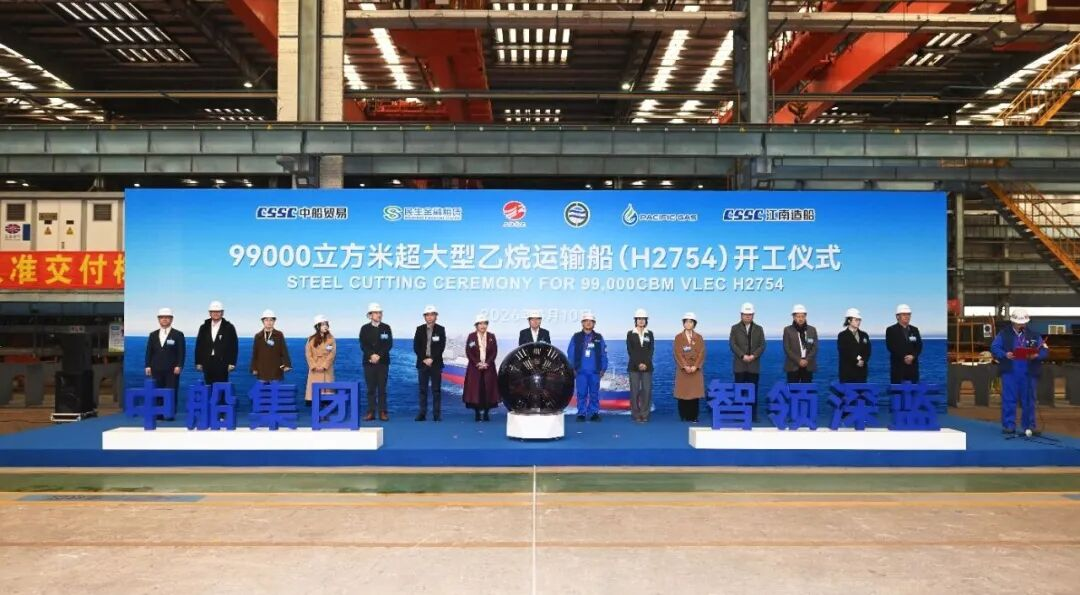 3月10日,中船江南造船为民生金租建造的99000立方米超大型乙烷运输船(99K VLEC)系列船首制船(H2754)正式开工。