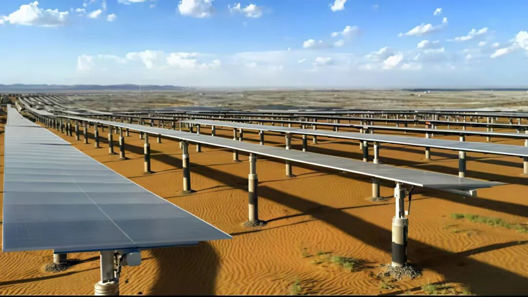 在双碳目标引领下,新疆全面推进“沙戈荒”光伏基地建设,通过光伏治沙促进能源与环境绿色发展。
